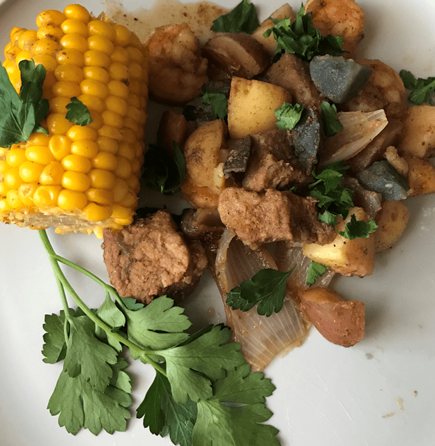 Prepare as directed above; scrub and quarter potatoes and parboil 5-7 mins. Add peeled and deveined shrimp, cubed steak, and cut onions to pot with drained potatoes and all seasonings except parsley. Mix thoroughly. Divide onto foil packs, and add 1-2 mini ears of corn, buttered and seasoned. Seal well and grill over medium high heat 5-7 mins. per side. Top with the chopped fresh parsley before serving.