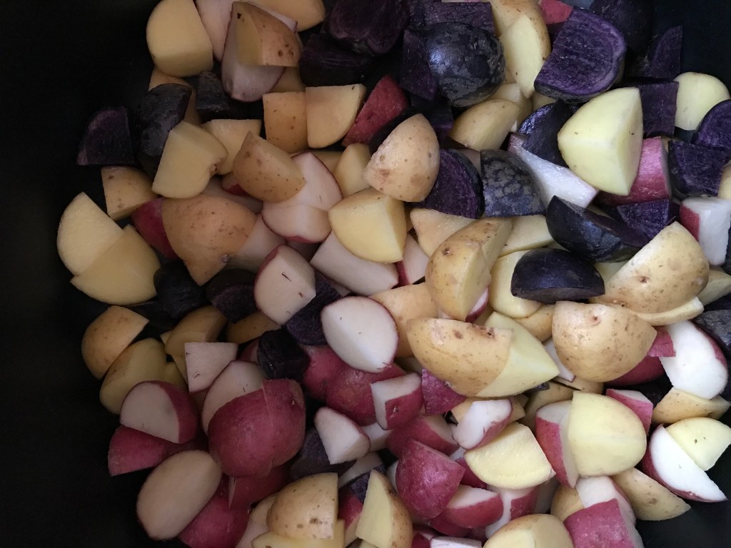 A rainbow of little (sometimes called “new”, “baby” or “fingerling”) potatoes formed the foundation. Prep involves scrubbing and quartering the little suckers, and then parboiling them for 5-7 minutes to kind of pre-soften them. They don’t spend enough time on the grill to cook through fully, but I promise this is the most cooking off the grill that needs to happen.