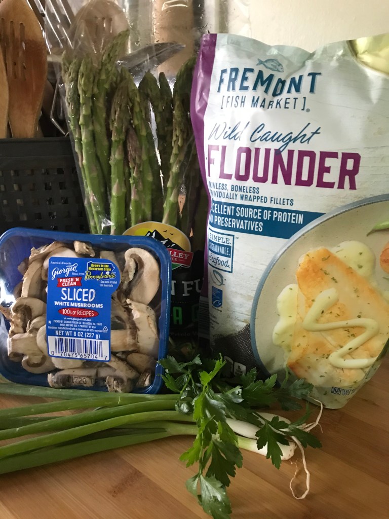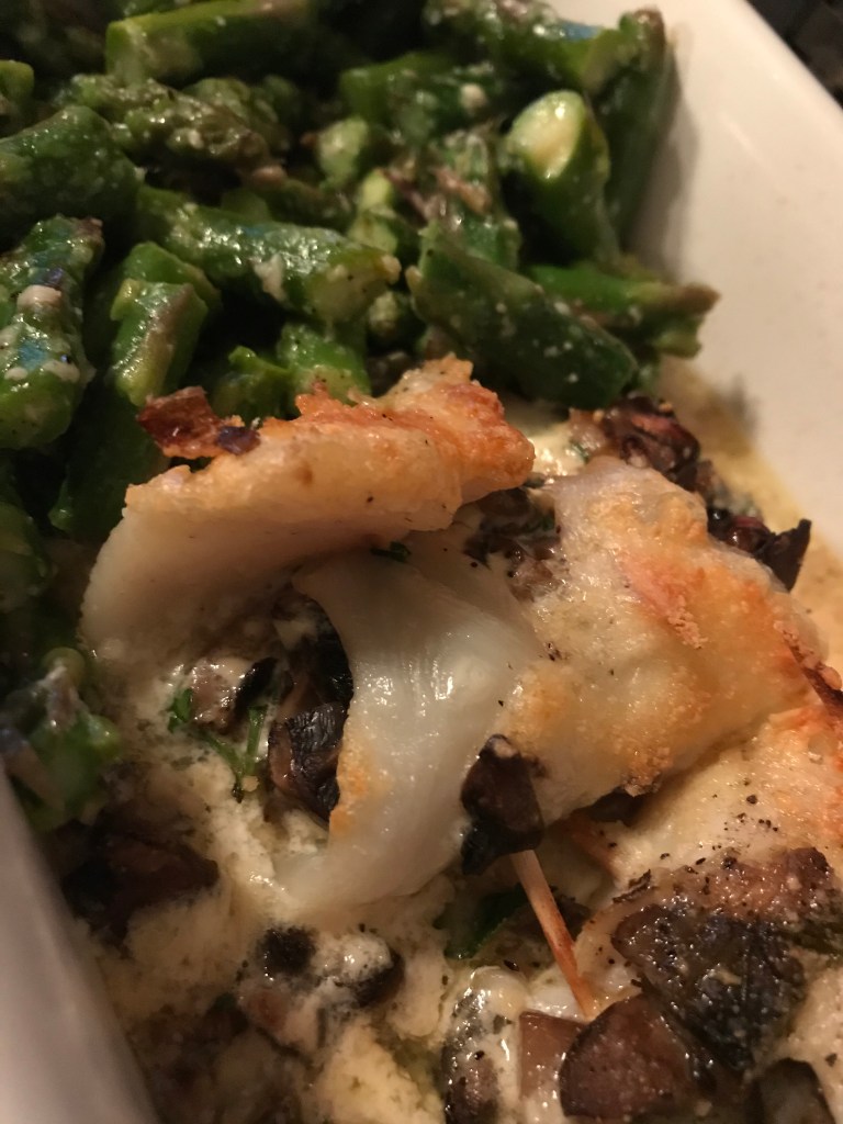 Typically, we eat fish once or twice a week. With all that is happening in the American meat-processing industry right now, fish is probably going to be a larger part of our diets for a while. That means I need more ways to prepare it, so I got creative with some existing preparations for these mushroom stuffed flounder rolls. Then I paired them with asparagus pieces seasoned with salt, pepper, and Parmesan all ready for roasting.