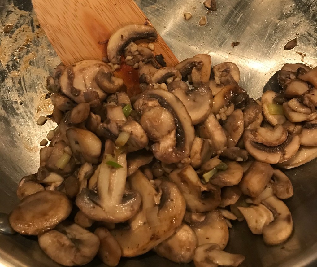 My starting point came from a Weight Watchers cookbook circa the early 1980s; I gave it a probably not-so-calorie-friendly twist with a sauce from another favorite fish recipe. The mushroom stuffing uses basic ingredients: garlic, mushrooms, scallions and parsley. A brief bath in the frying pan with some olive oil until golden brown and some chopping yields the stuffing mix for the flounder fillets – thinner works better for rolling.