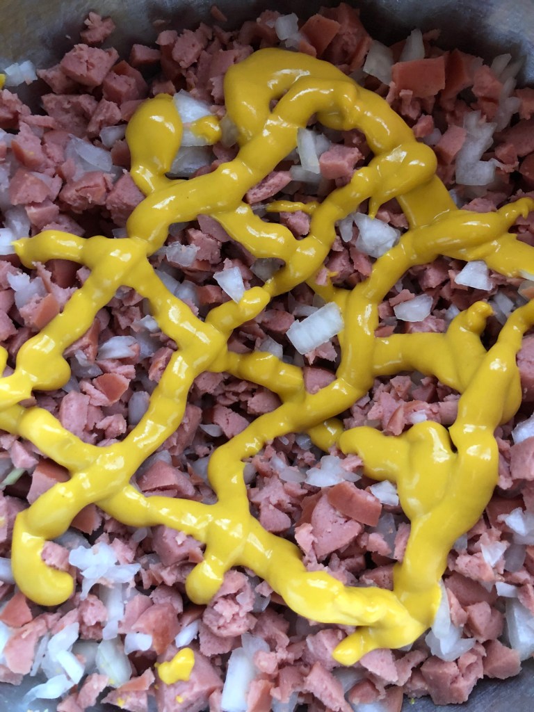 After the frying, I rinse them in a colander and pat them dry with paper towels to get as much of the wrapper-destroying grease off as possible. I mix this with very finely chopped white onion and about two Tbsp (a couple good squirts) of yellow mustard. It should just have a very thin coating by this point – you just want the briefest of those flavors here.