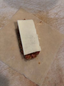Place each wrapper in front of you and add about 2 Tbsp of the Hotchee dog mixture. Then top with 1/2 a slice of American “cheese” :), roll egg-roll style, and brush the edges with egg white for a better seal.