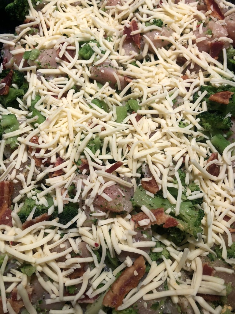 - Add broccoli and bacon to chicken and mix. Turn into greased baking dish and top with shredded cheese.