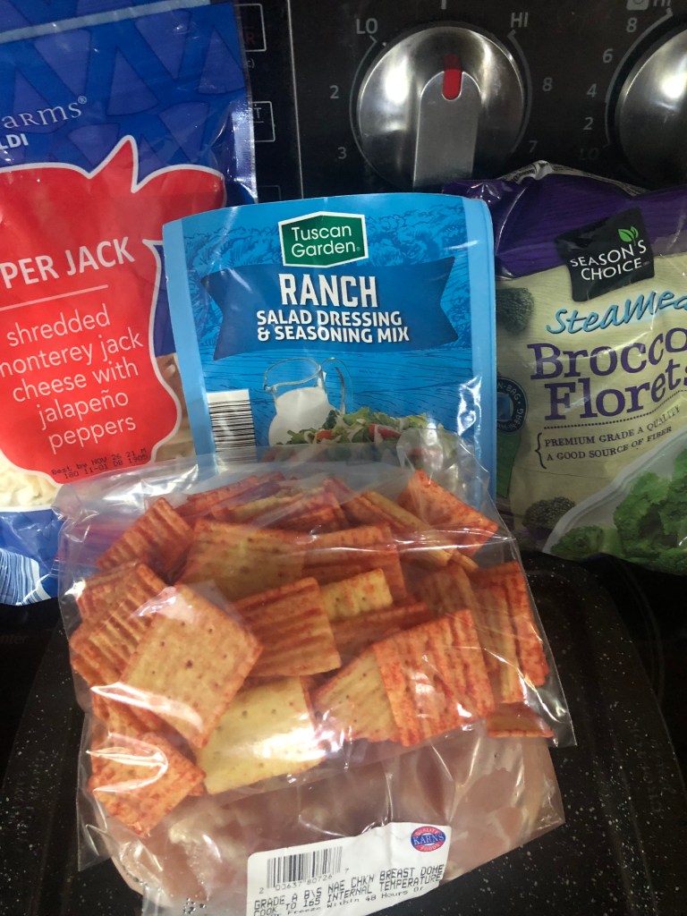 - Preheat oven to 375 degrees F. Thaw broccoli and coarsely chop. Cut chicken into 1″ cubes and toss with ranch seasoning mix. Crush cheese crackers and set aside.