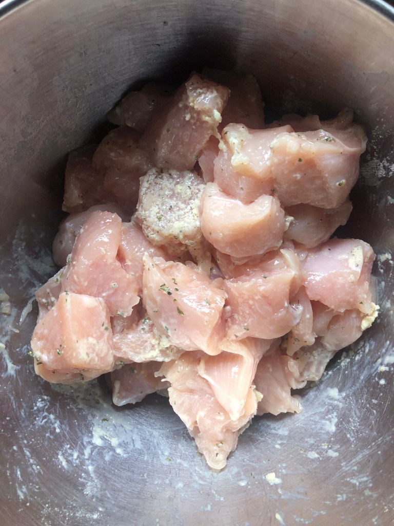 Cut the chicken into cubes about 1″ in size and toss them with the ranch seasoning mix.